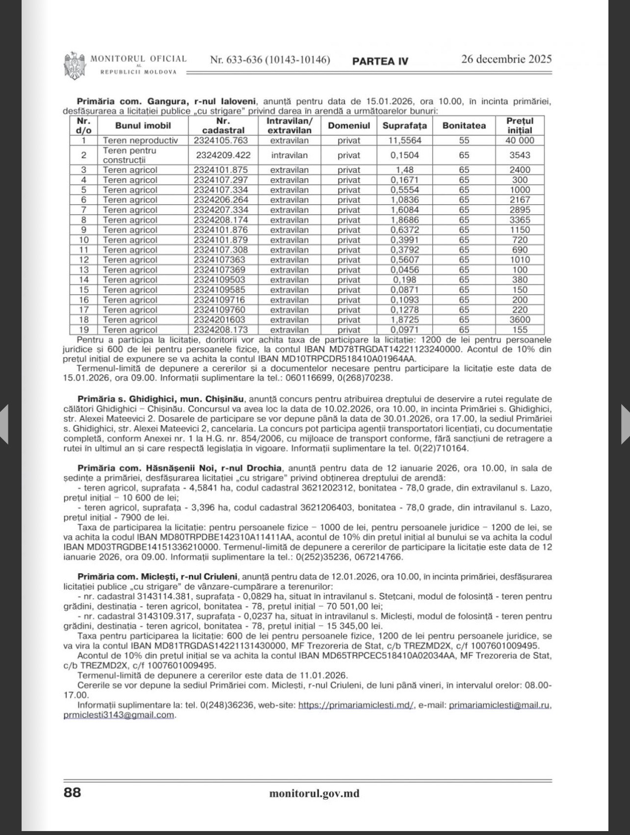 Primăria comunei Gangura anunță licitație publică cu strigare pentru terenurile proprietate UAT Gangura la data de 15 ianuarie ora 10:00 conform anunțului de participare din monitorul oficial .